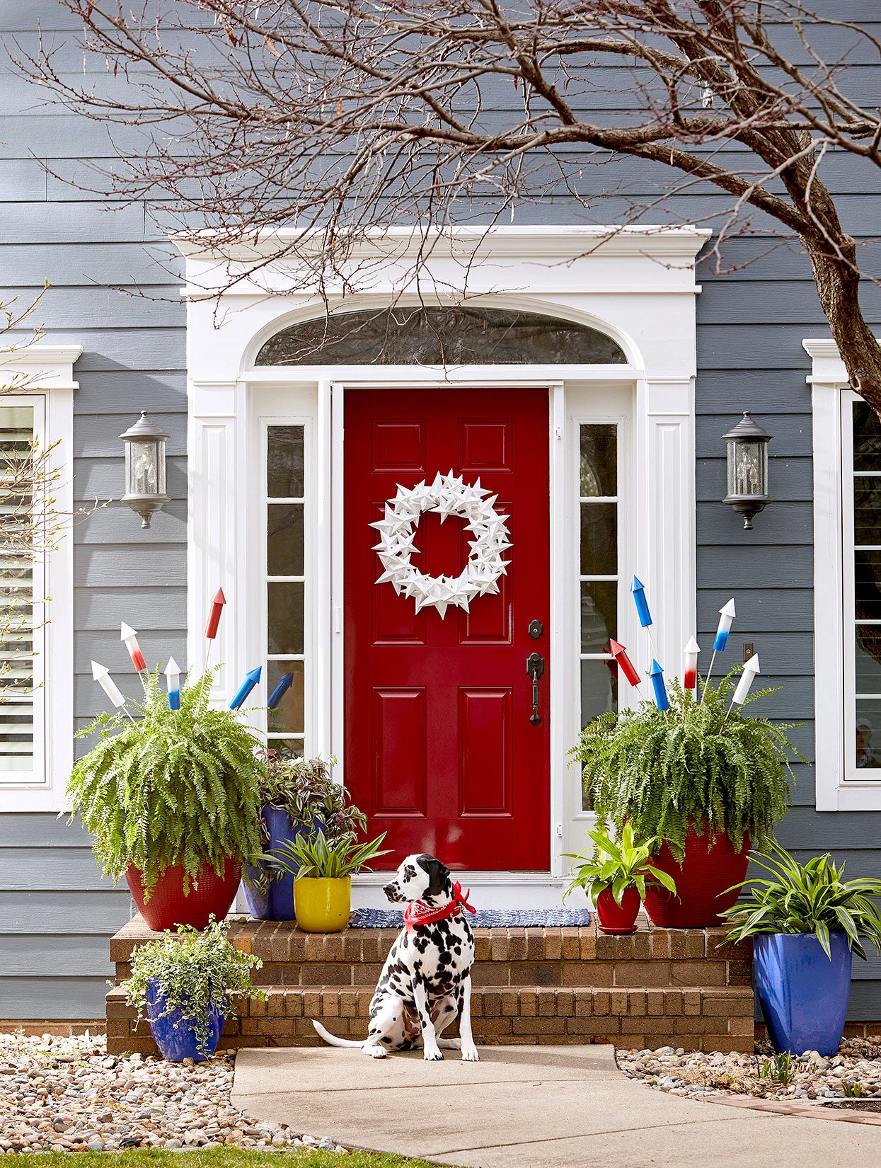 Bright red or blue doors are great for a patriotic exterior space, and many homes already have them! Accessorize the front of your home with a white wreath (preferably a star-wreath like the one in the photo!) striped doormat, and potted planters with either blue or red flowers and/or faux firecrackers. Of course, don’t forget to hang the American flag, too. And viola! You now have a perfectly patriotic front porch with a color scheme that can work year-round.