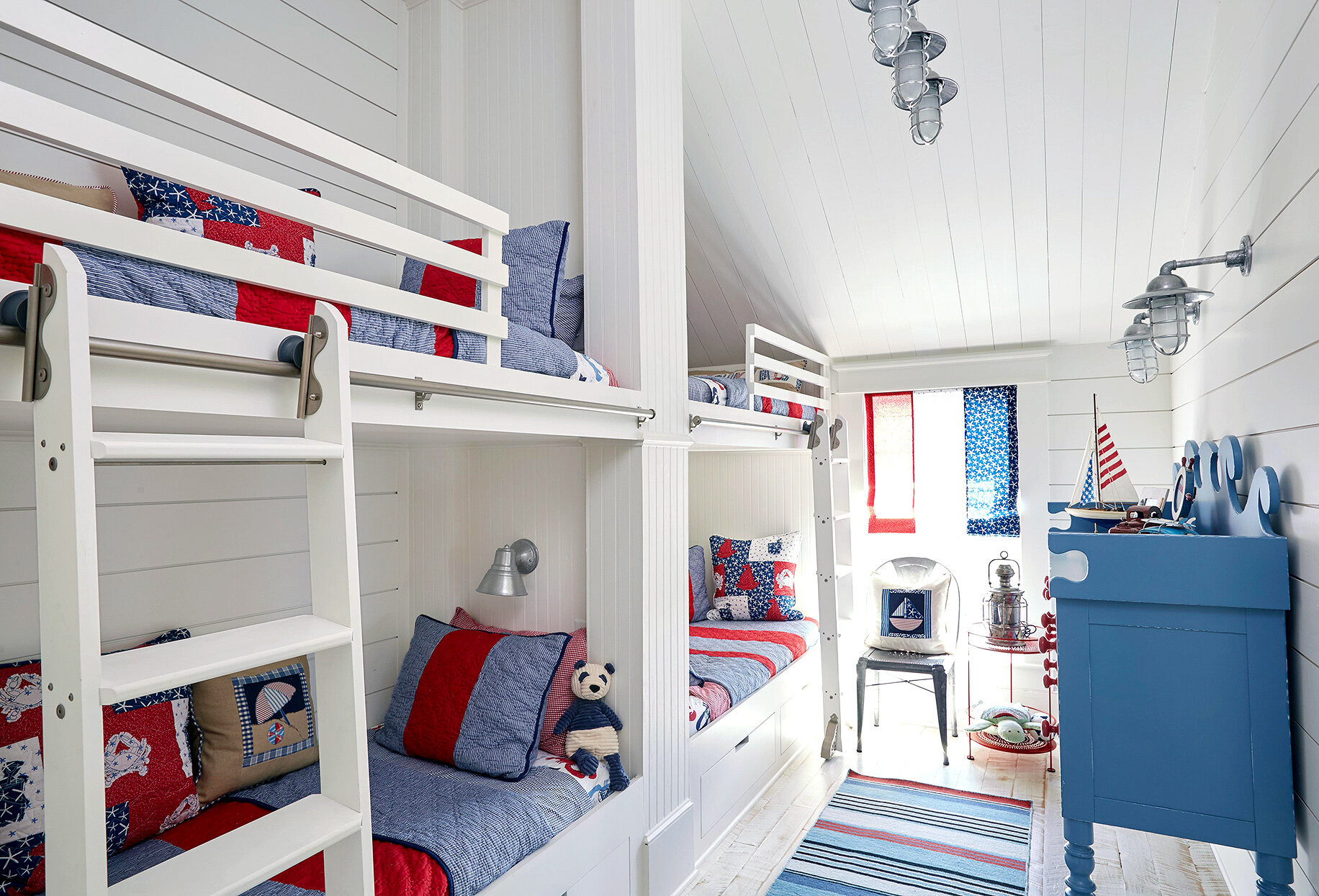 Dress your beds with red, white, and blue linens including sheets, comforters, duvet covers and pillows. Carry the color scheme into the throw rugs and curtains as well.