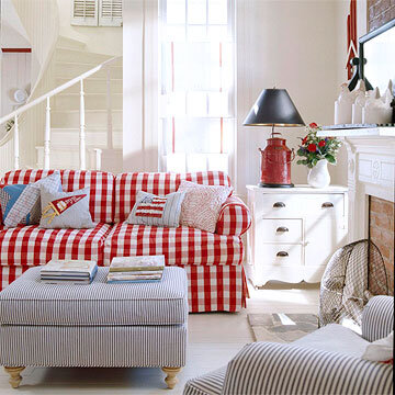 Decorative pillows with red, white and blue fabric add an instant Americana feel to your living spaces. Try layering patriotic colors with star spangled motifs, such as stars and stripes. You can also switch in patriotic colored table lamps and books to accessorize shelving with.