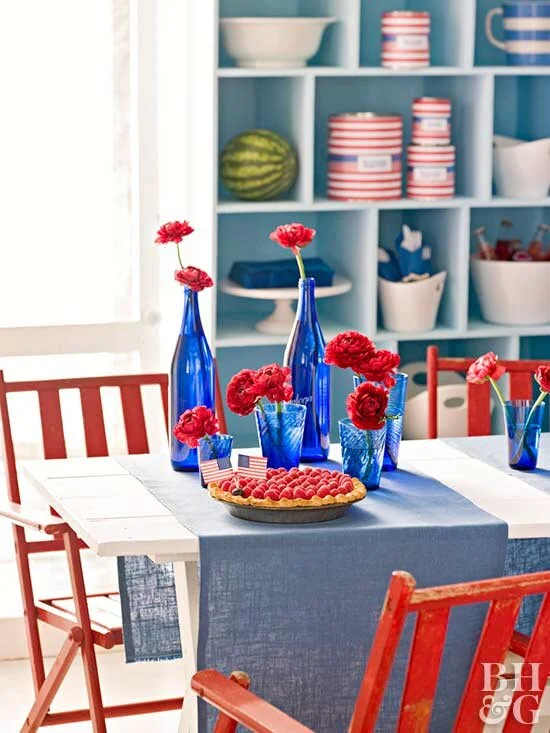Transform your kitchen by simply replacing everyday items with ones in a festive color, such as dish towels, jars, and trays. Use Fourth of July items like sparklers as centerpieces on your kitchen table, accompanied by red or blue flowers, vases, and china. Let the apple and cherry pie, other sweet treats, and BBQ snacks bring everything together for the ultimate festive fourth of July inspired kitchen!